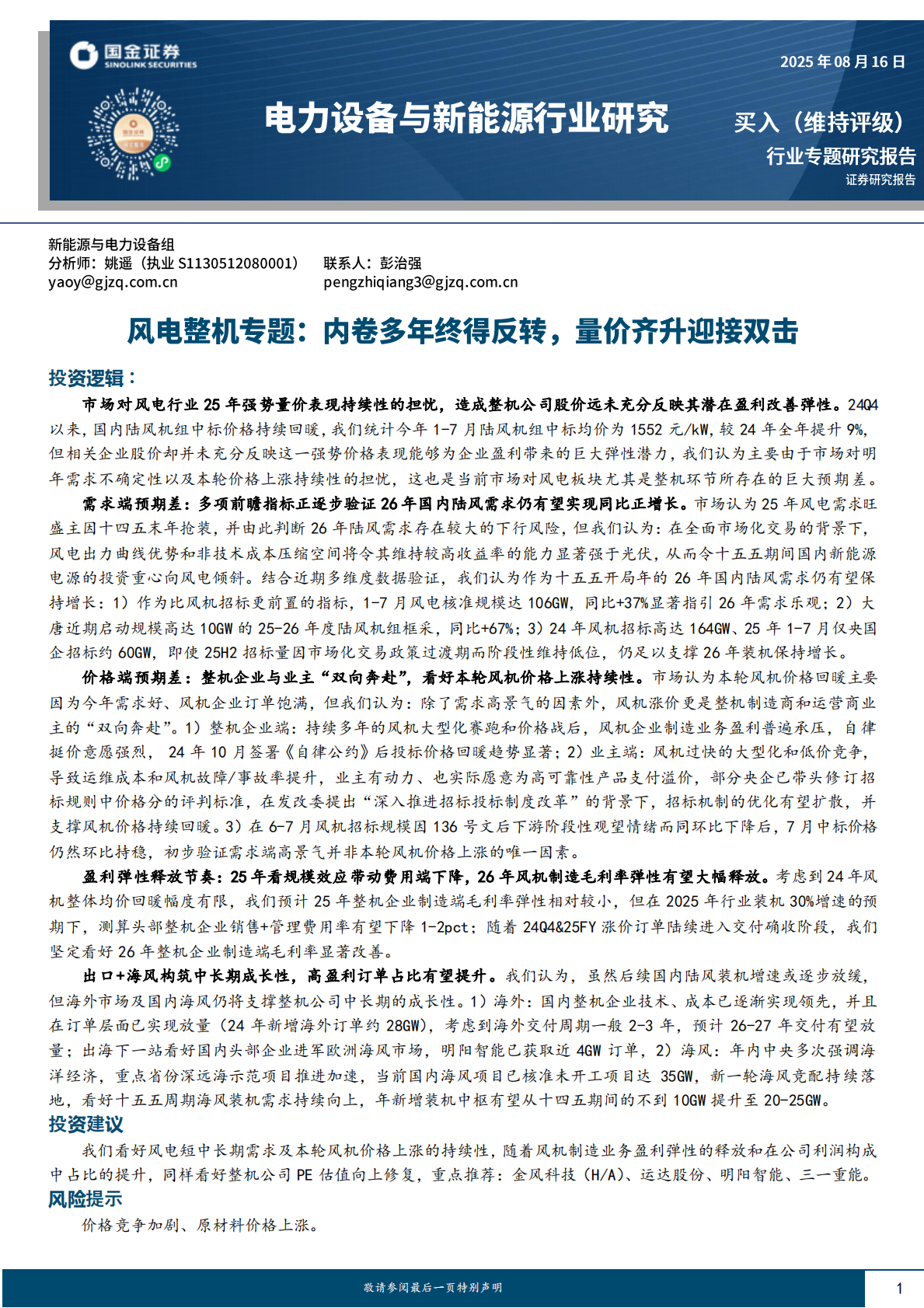 国金证券:电力设备与新能源行业风电整机专题:内卷多年终得反转,量价齐升迎接双击