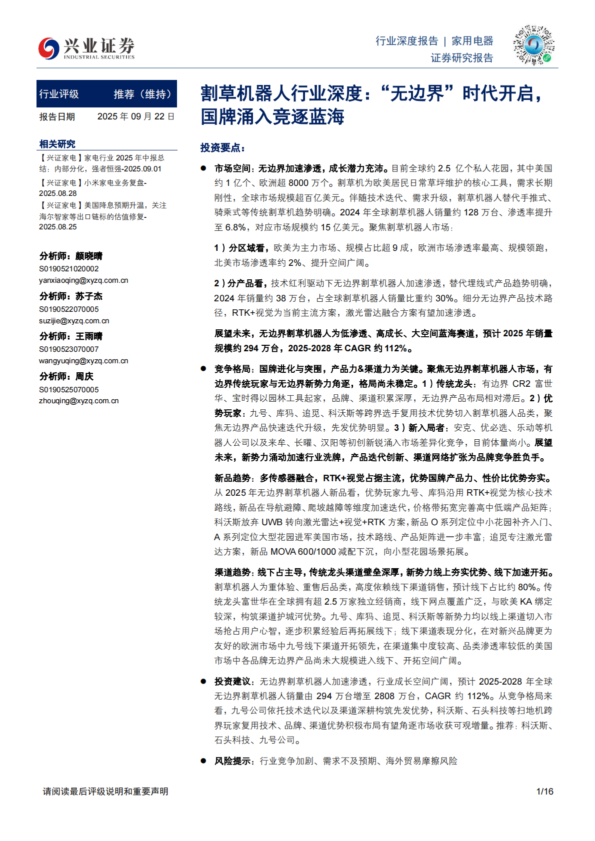 兴业证券:割草机器人行业深度:“无边界”时代开启,国牌涌入竞逐蓝海