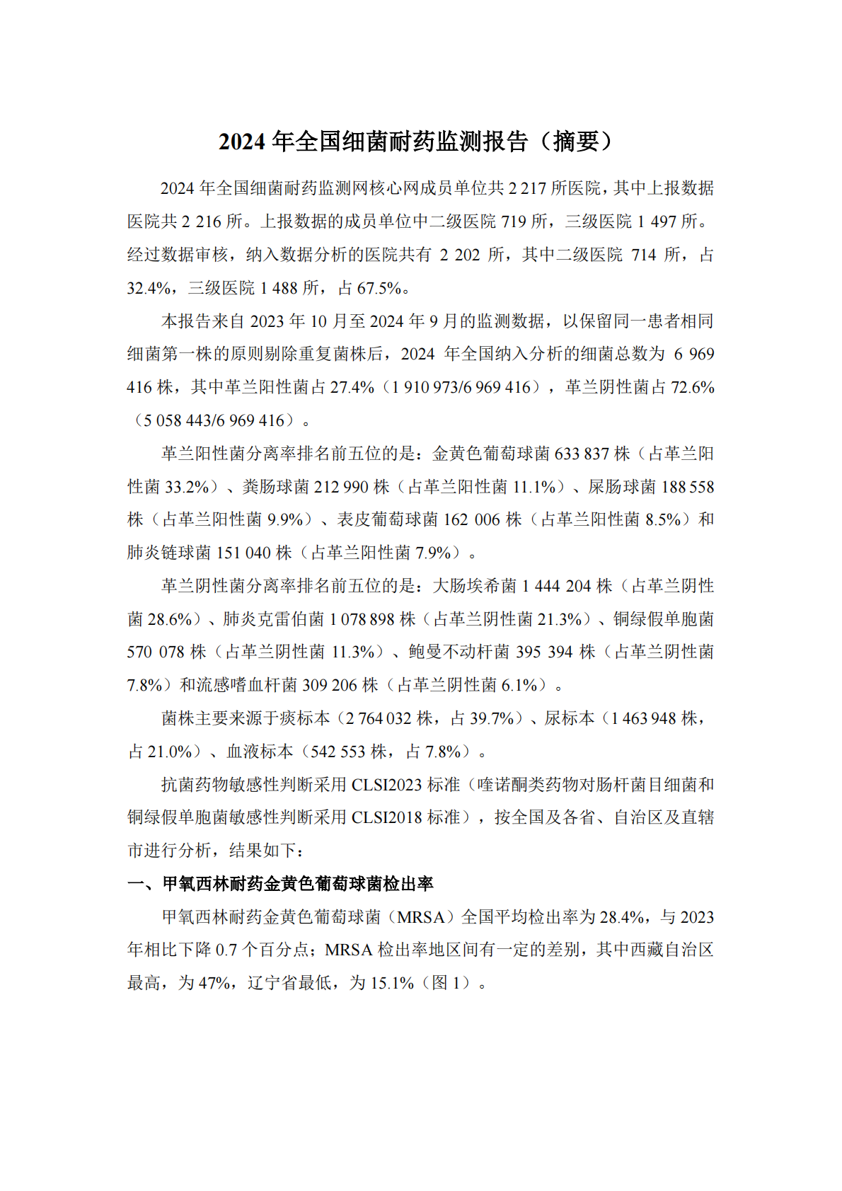 全国细菌耐药监测网:2024年全国细菌耐药监测报告(简要版)