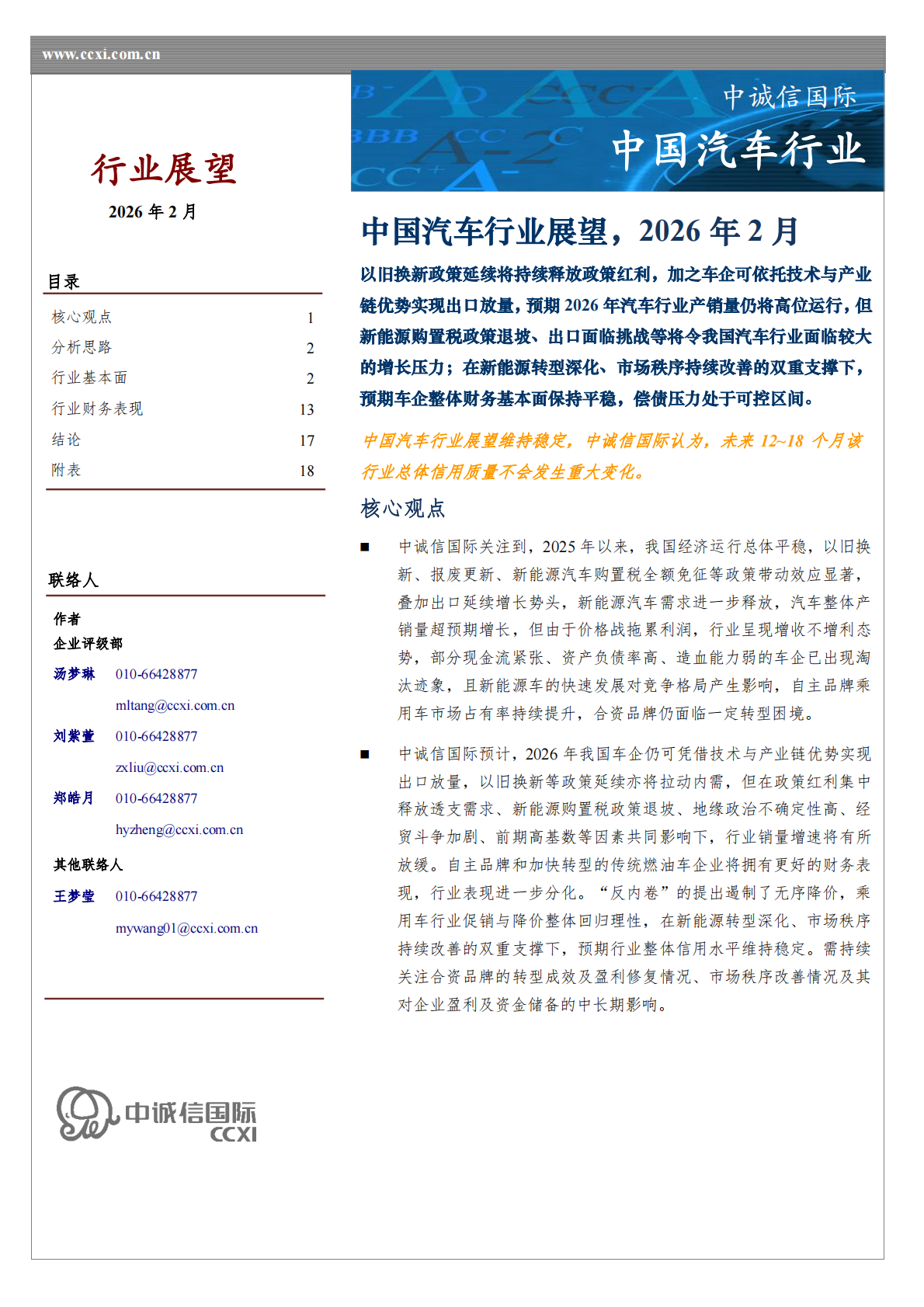 中诚信国际:中国汽车行业展望,2026年2月