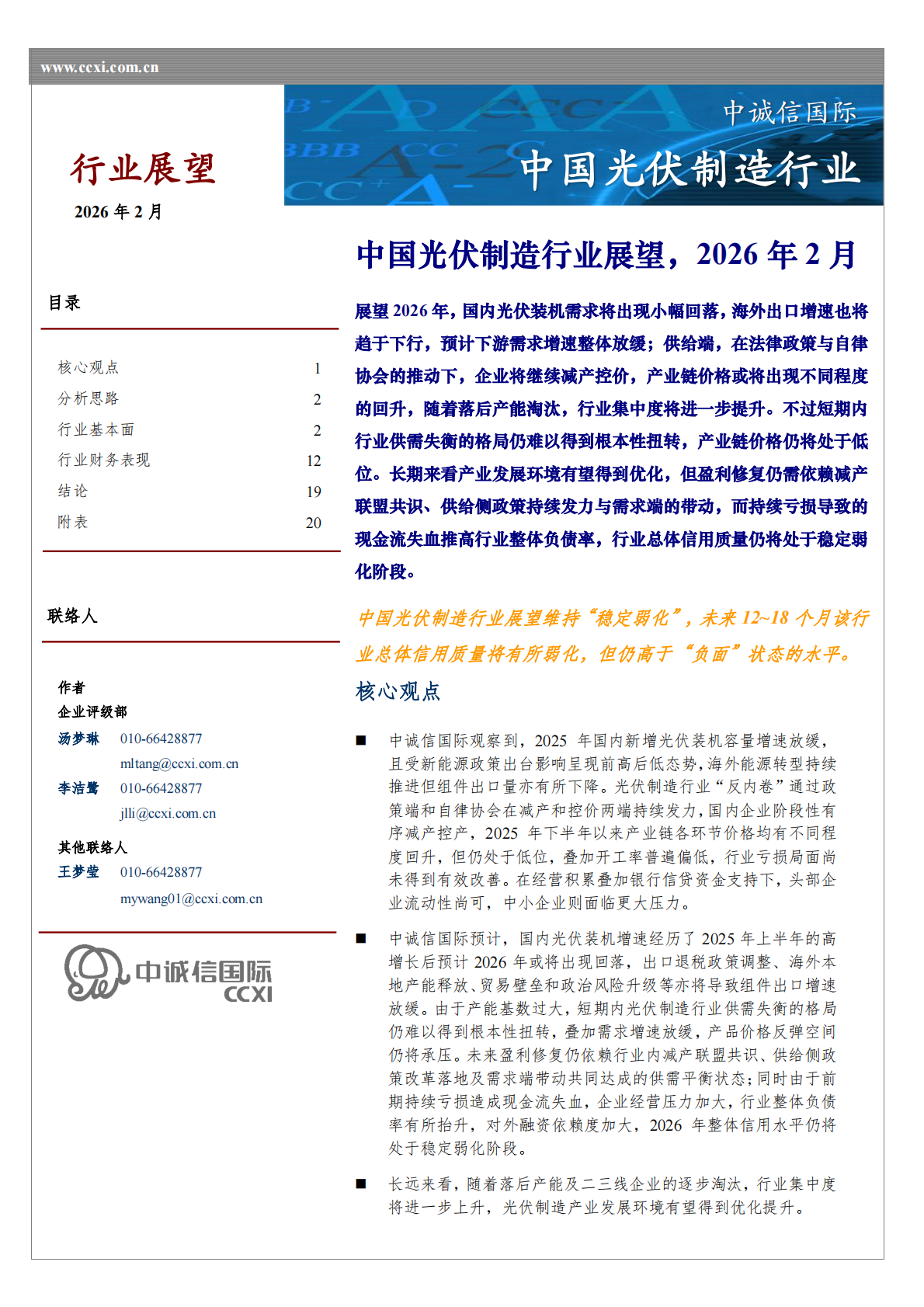 中诚信国际:中国光伏制造行业展望,2026年2月