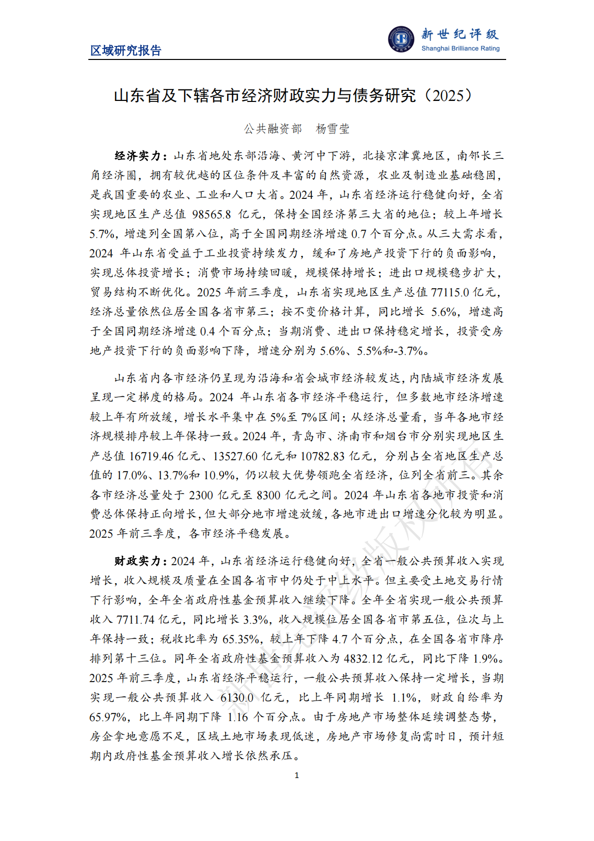 新世纪评级:山东省及下辖各市经济财政实力与债务研究(2025)