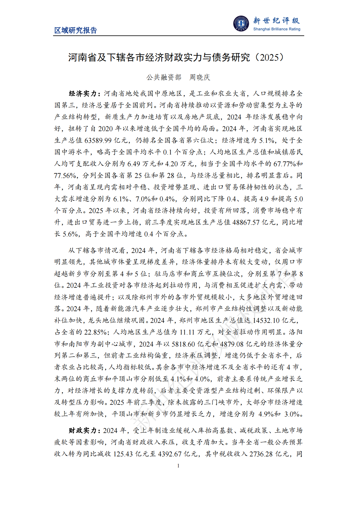 新世纪评级:河南省及下辖各市经济财政实力与债务研究(2025)