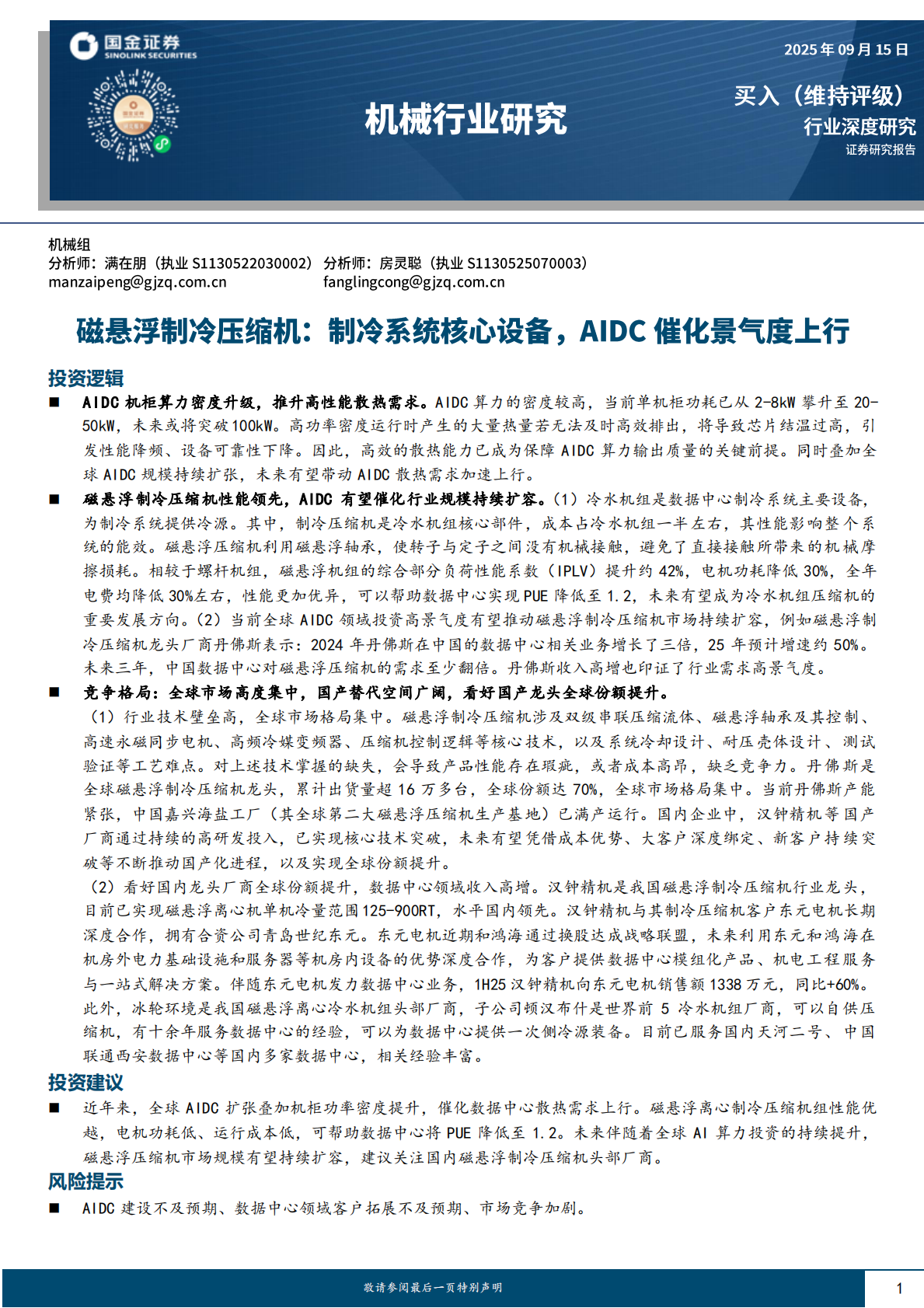 国金证券:机械行业研究:磁悬浮制冷压缩机:制冷系统核心设备,AIDC催化景气度上行